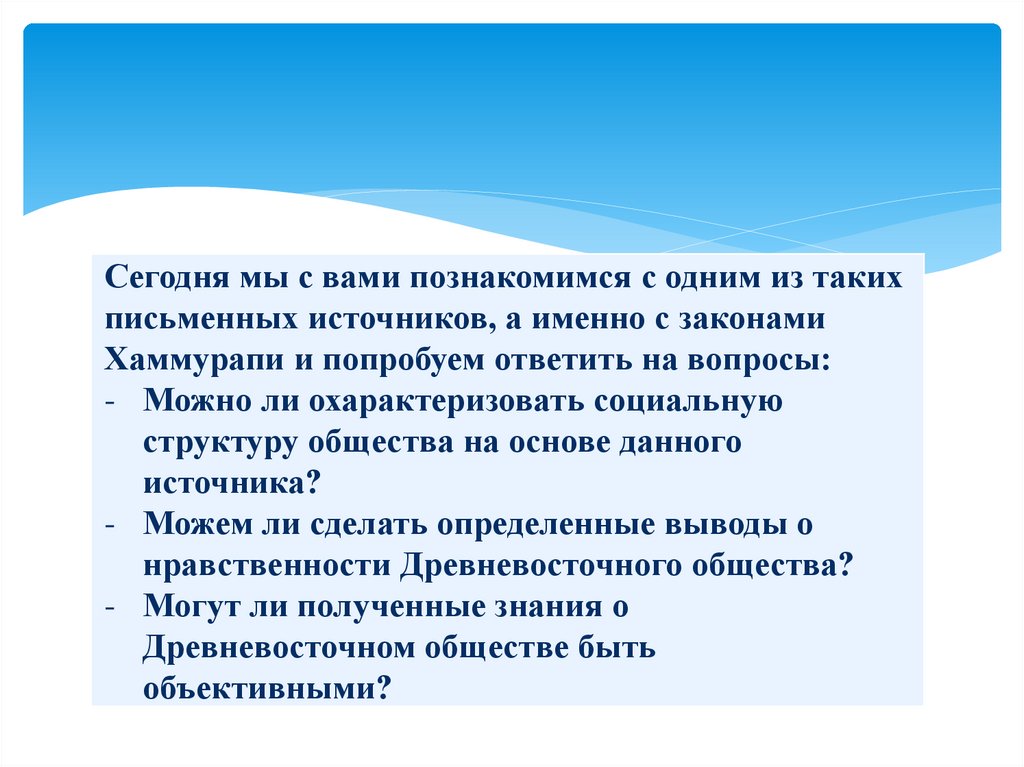 Сегодня мы с вами познакомимся с одним из такихписьменных источников, а именно с законами