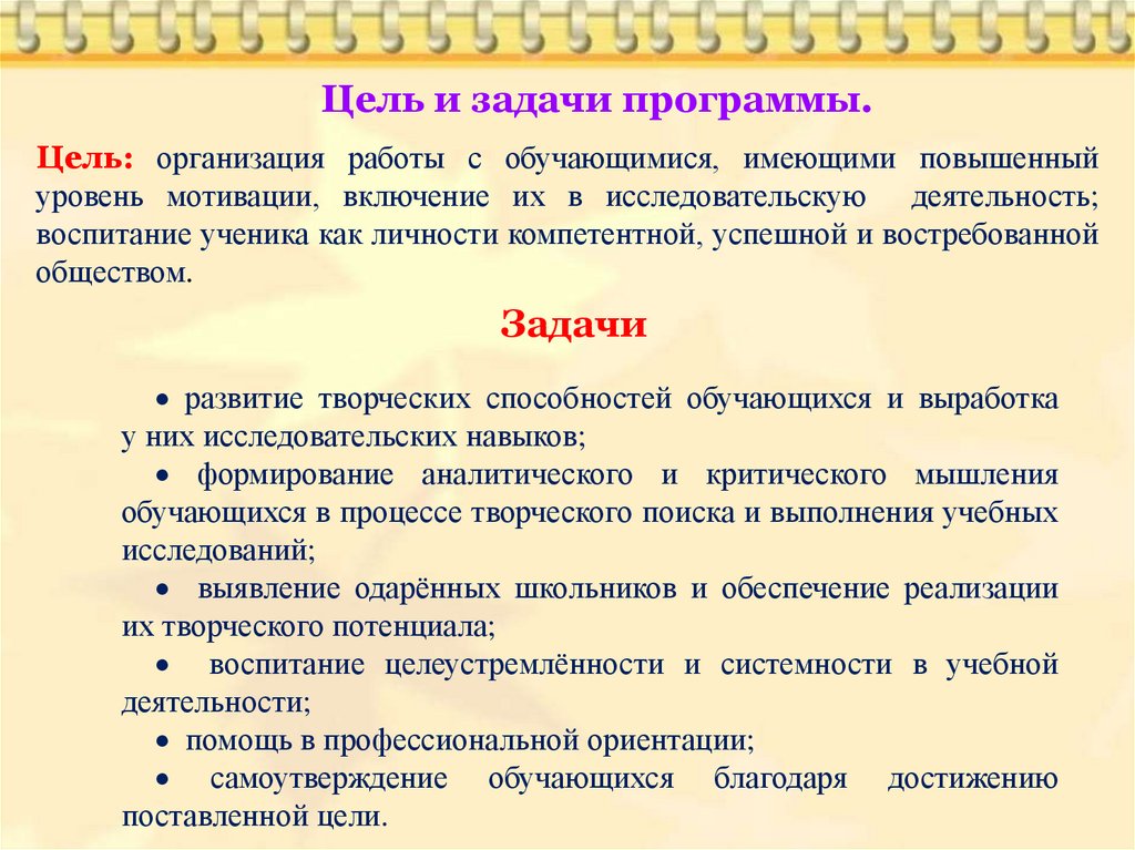 Цель и задачи программы.Цель: организация работы с обучающимися, имеющими повышенный