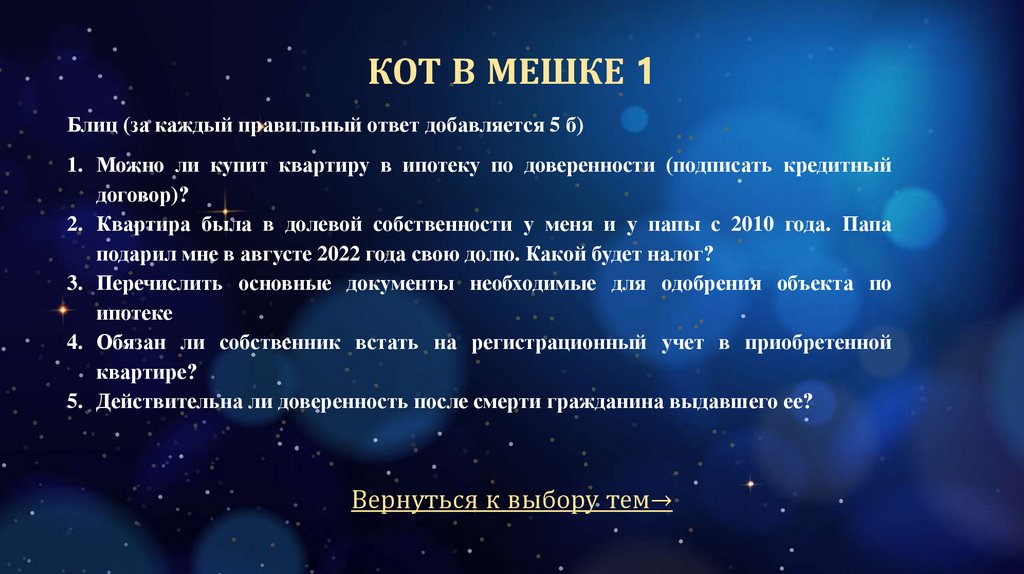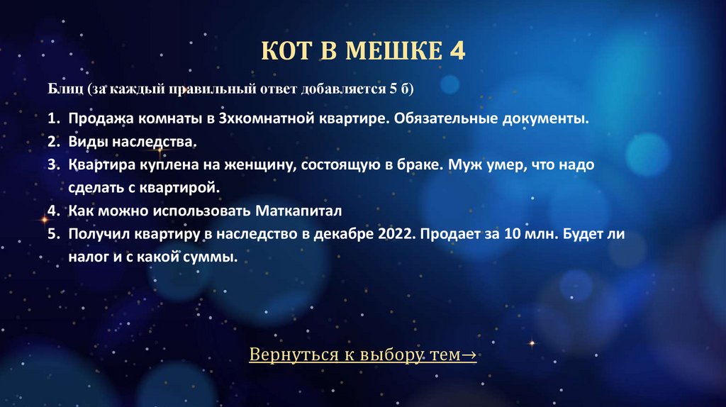 КОТ В МЕШКЕ 4Блиц (за каждый правильный ответ добавляется 5 б)