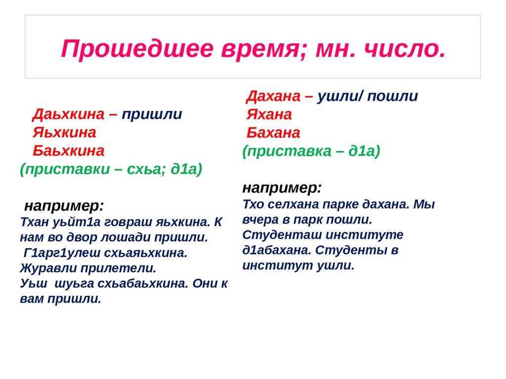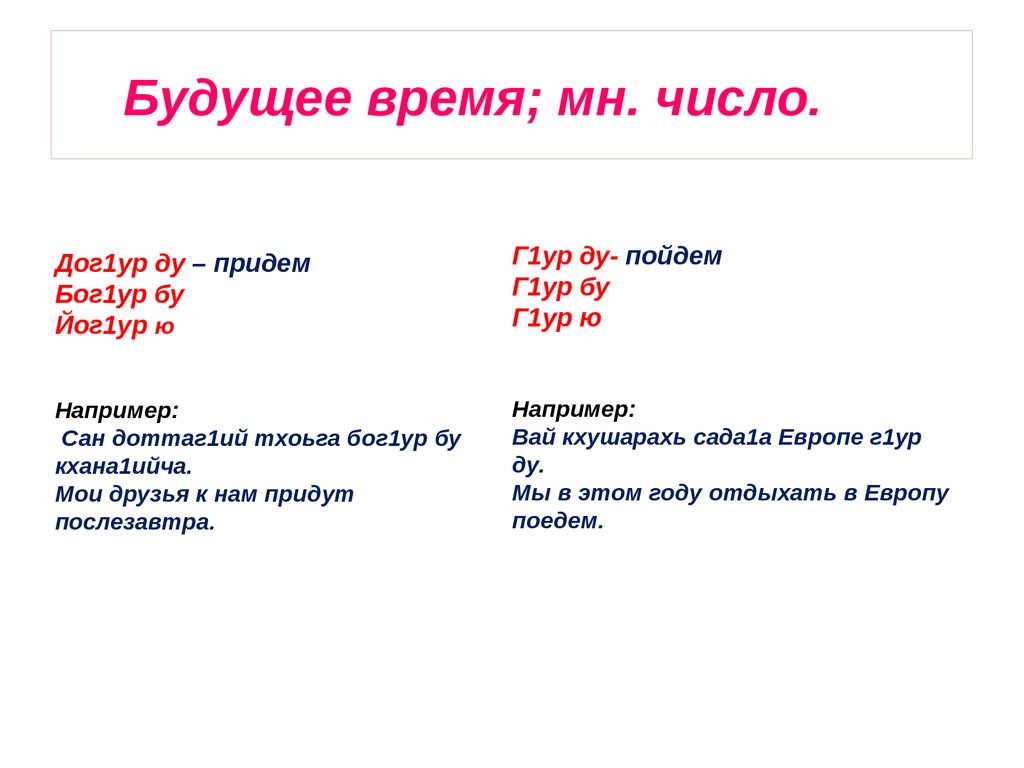 Мн. число наст., пр., будущ. времени.дог1у- даьхкина- дог1ур ду