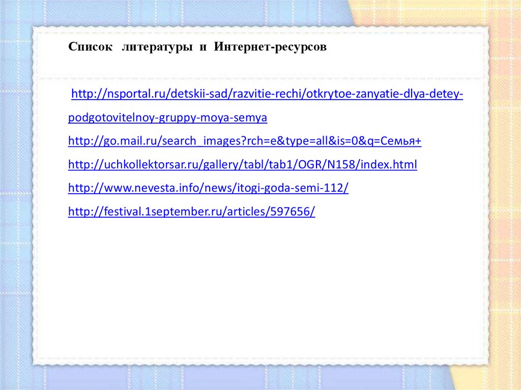 Список литературы и Интернет-ресурсовhttp://nsportal.ru/detskii-sad/razvitie-rechi/otkrytoe-zanyatie-dlya-deteypodgotovitelnoy-gruppy-moya-semya