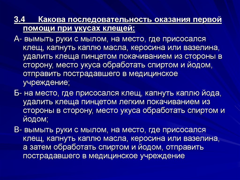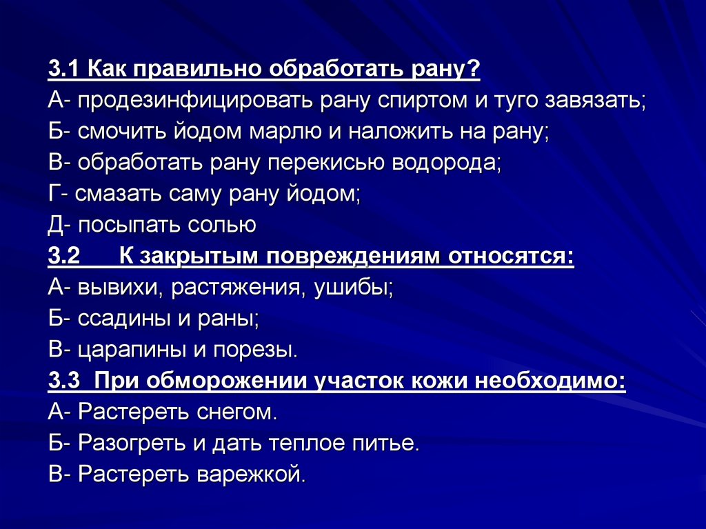 3.1 Как правильно обработать рану?А- продезинфицировать рану спиртом и туго завязать;