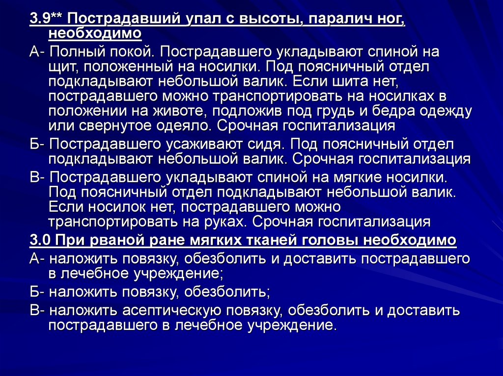 3.9** Пострадавший упал с высоты, паралич ног,необходимо