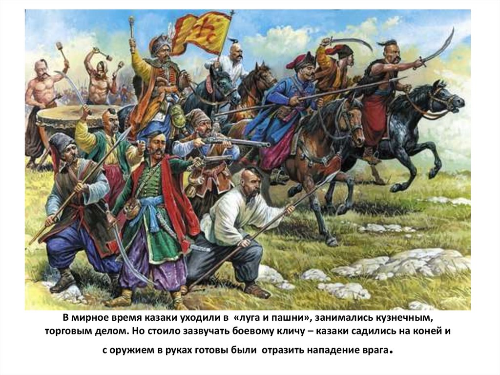 В мирное время казаки уходили в «луга и пашни», занимались кузнечным,торговым делом. Но стоило зазвучать боевому кличу – казаки садились на коней и