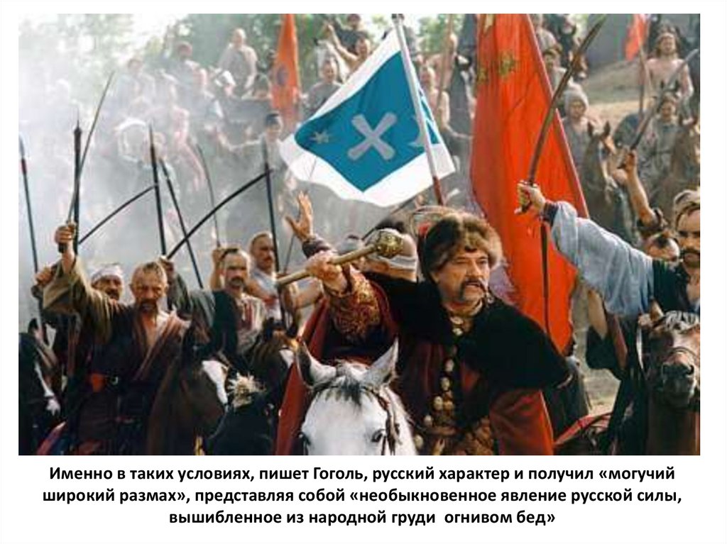 Именно в таких условиях, пишет Гоголь, русский характер и получил «могучийширокий размах», представляя собой «необыкновенное явление русской силы,