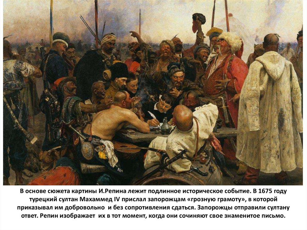 В основе сюжета картины И.Репина лежит подлинное историческое событие. В 1675 годутурецкий султан Махаммед IV прислал запорожцам «грозную грамоту», в которой