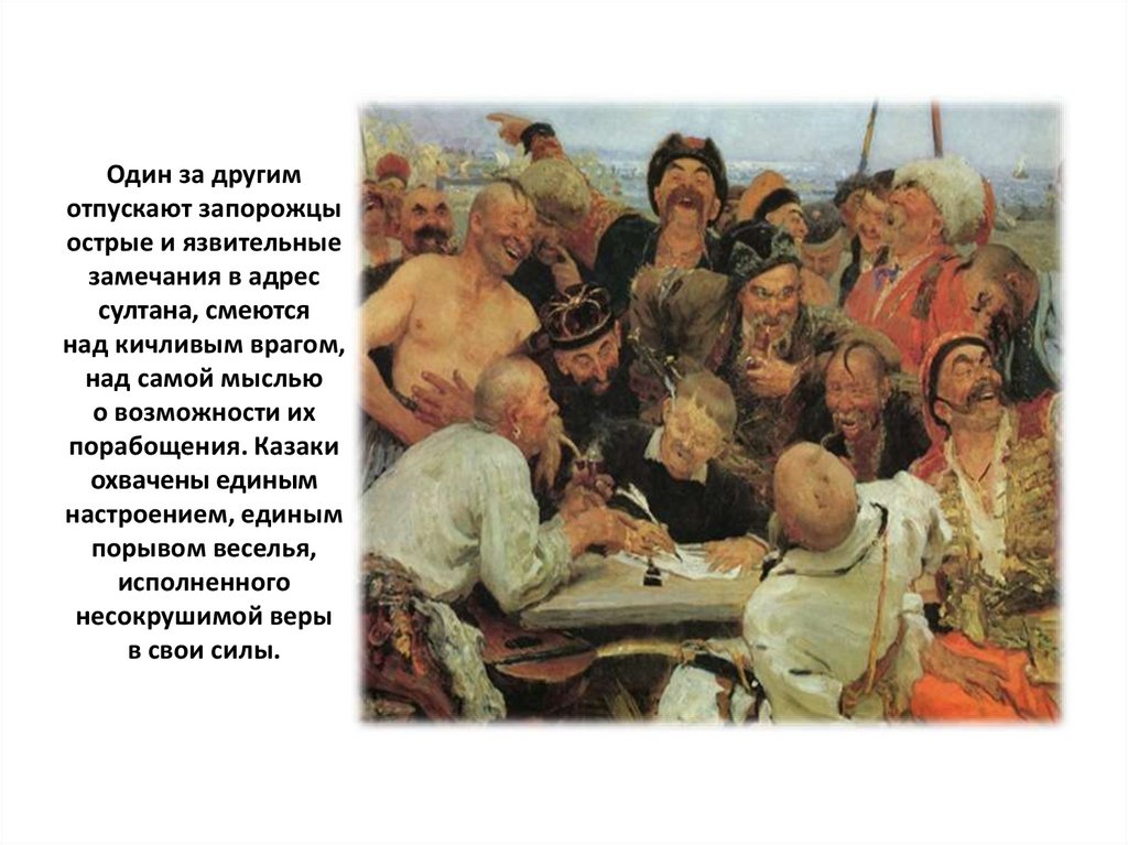 ответ. Репин изображает их в тот момент, когда они сочиняют свое знаменитое письмо.