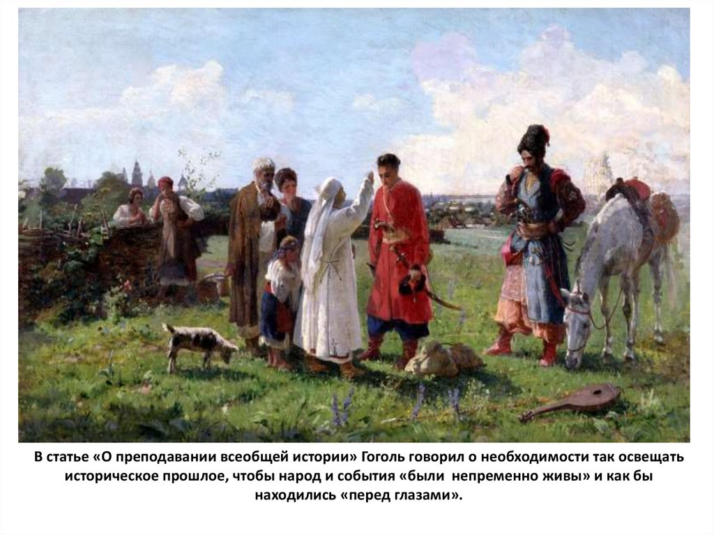В статье «О преподавании всеобщей истории» Гоголь говорил о необходимости так освещатьисторическое прошлое, чтобы народ и события «были непременно живы» и как бы