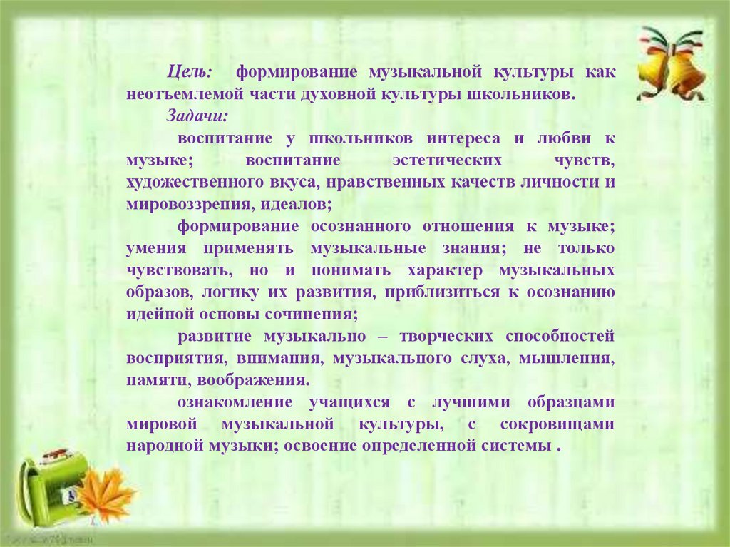 Цель: формирование музыкальной культуры какнеотъемлемой части духовной культуры школьников.