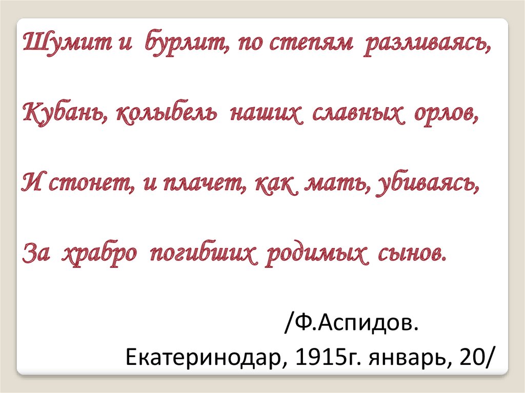 Шумит и бурлит, по степям разливаясь,Кубань, колыбель наших славных орлов,