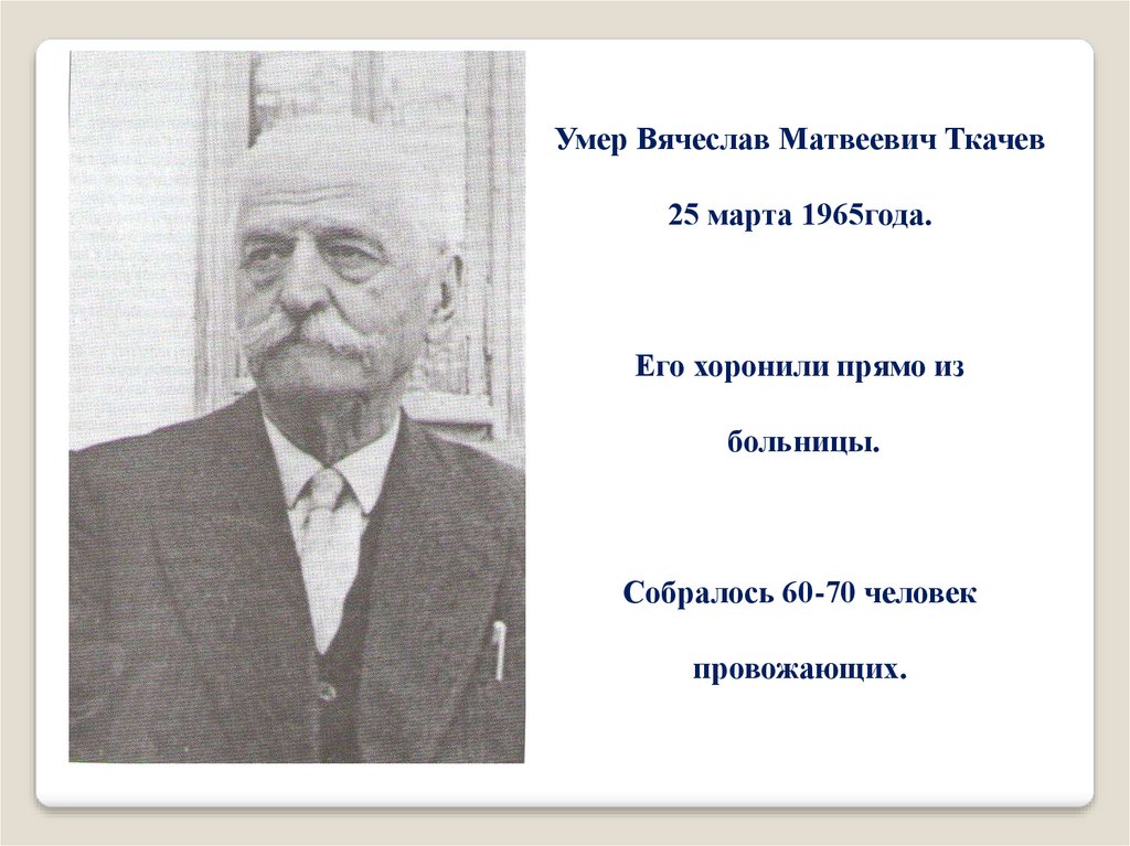 Умер Вячеслав Матвеевич Ткачев25 марта 1965года.