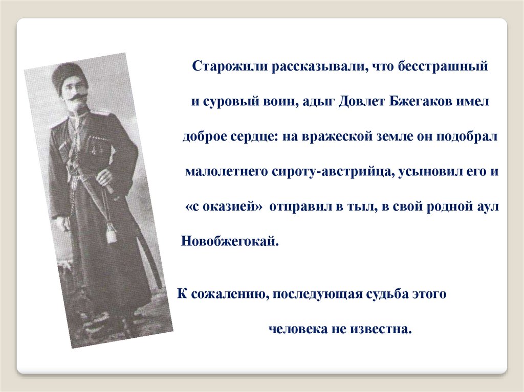 Старожили рассказывали, что бесстрашныйи суровый воин, адыг Довлет Бжегаков имел