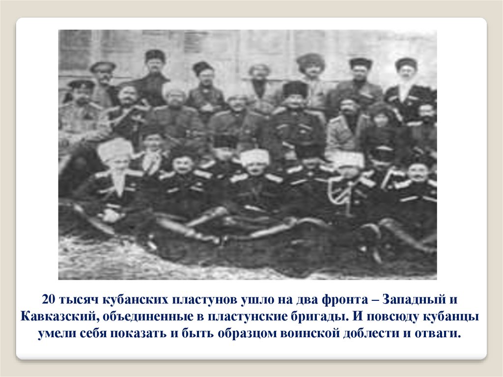 20 тысяч кубанских пластунов ушло на два фронта – Западный иКавказский, объединенные в пластунские бригады. И повсюду кубанцы