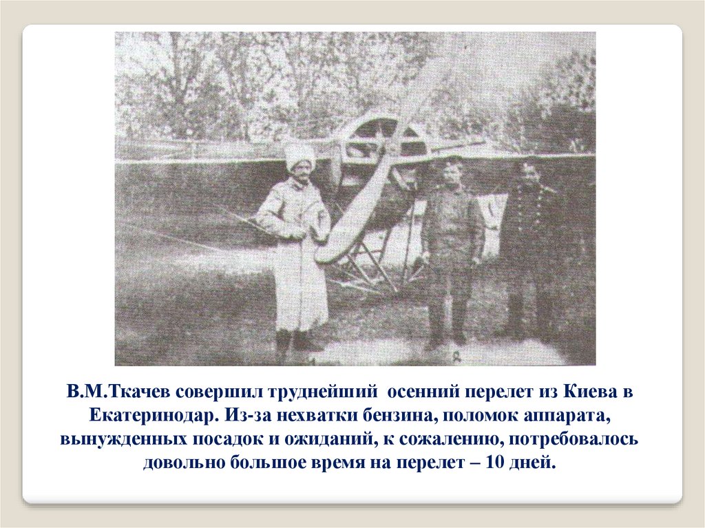 В.М.Ткачев совершил труднейший осенний перелет из Киева вЕкатеринодар. Из-за нехватки бензина, поломок аппарата,