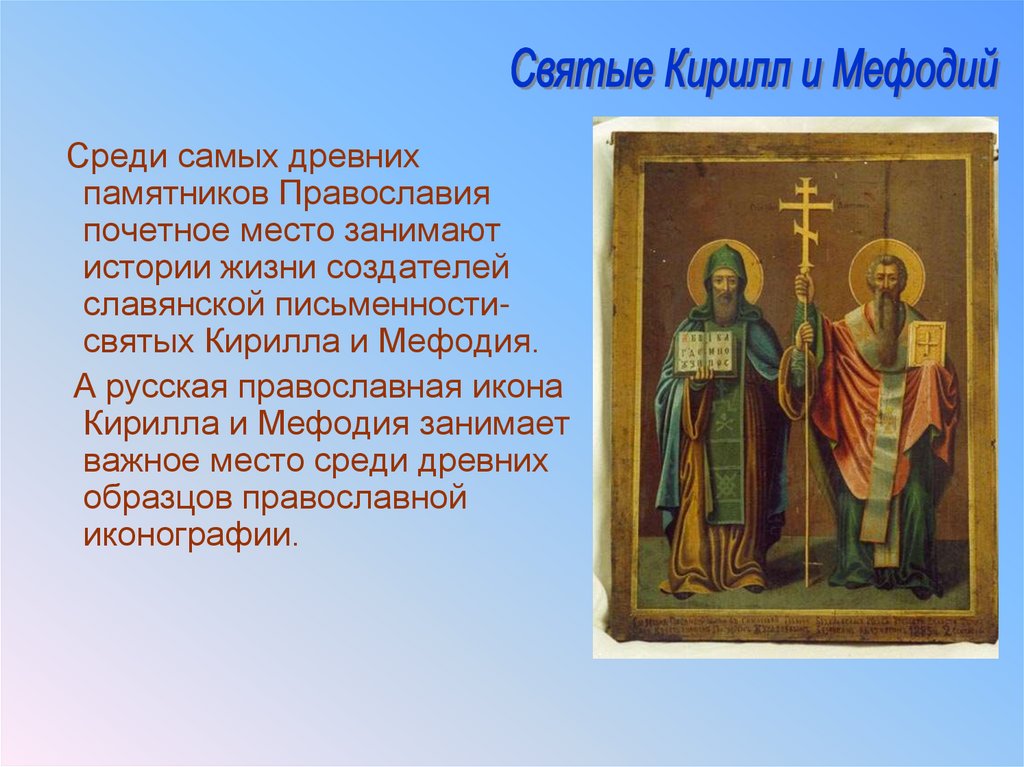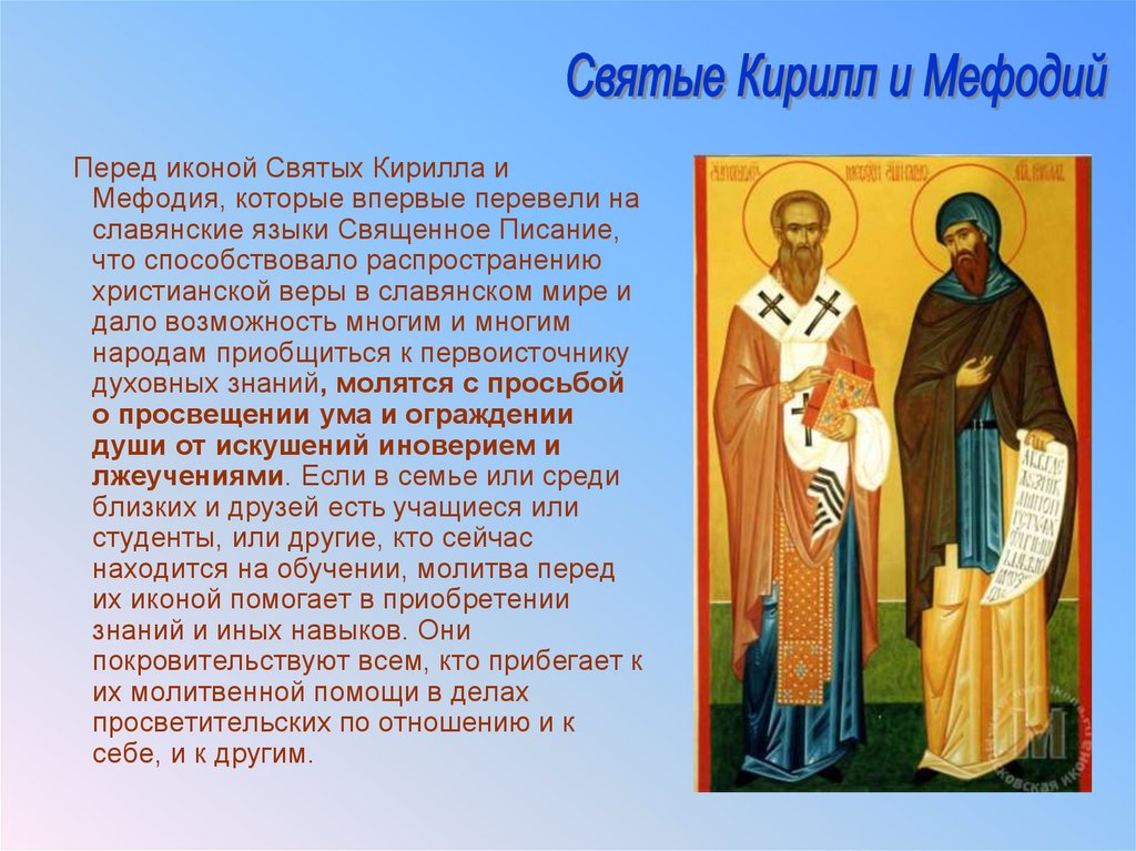 славянских учителей, равноапостольных Мефодия и Кирилла. Благодаря