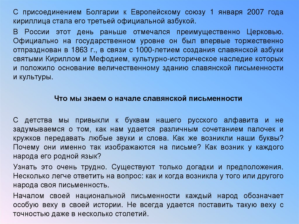 С присоединением Болгарии к Европейскому союзу 1 января 2007 годакириллица стала его третьей официальной азбукой.