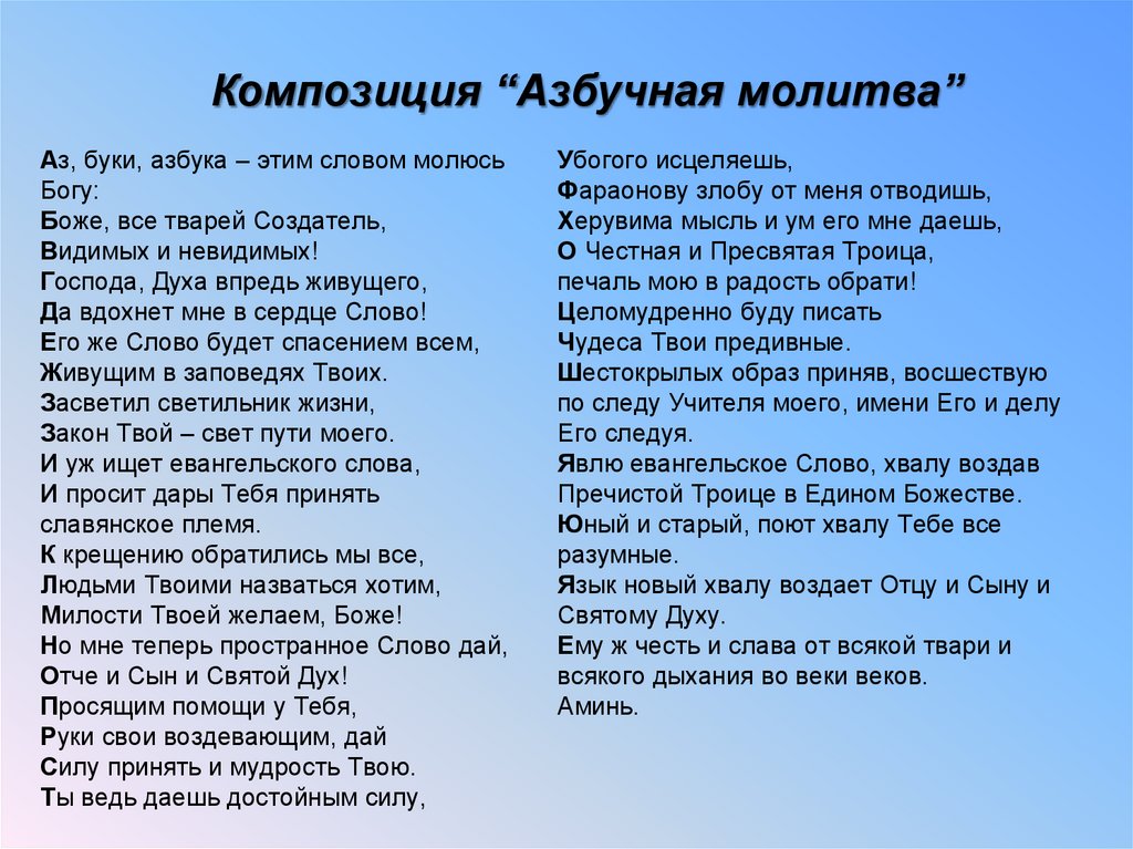 Композиция “Азбучная молитва”Аз, буки, азбука – этим словом молюсь