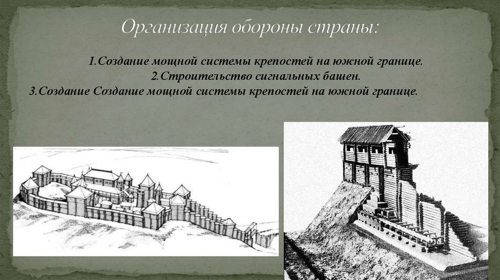 1.Создание мощной системы крепостей на южной границе.2.Строительство сигнальных башен.