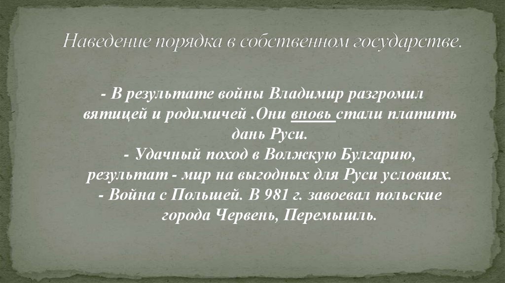 - В результате войны Владимир разгромилвятицей и родимичей .Они вновь стали платить