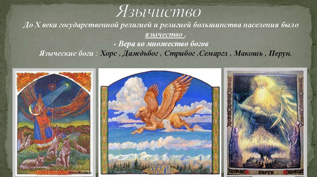Языческие боги : Хорс , Даждьбог , Стрибог ,Семаргл , Макошь , Перун.