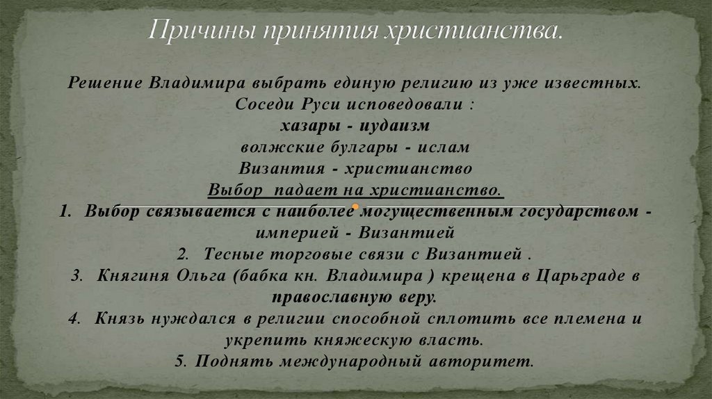Решение Владимира выбрать единую религию из уже известных.Соседи Руси исповедовали :