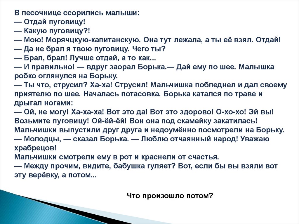 Мне было противно с ним разговаривать, и я пошёл домой. Черезоткрытое окошко я услышал, как Борька сказал мальчишкам: