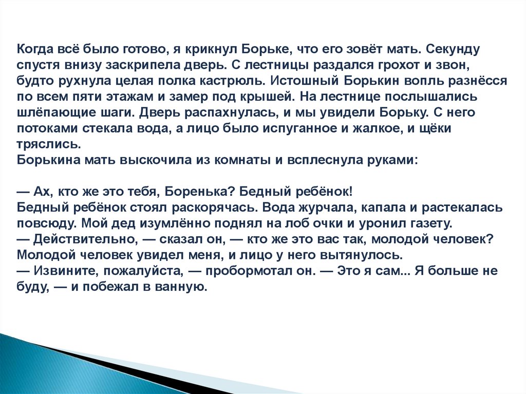 Когда всё было готово, я крикнул Борьке, что его зовёт мать. Секундуспустя внизу заскрипела дверь. С лестницы раздался грохот и звон,