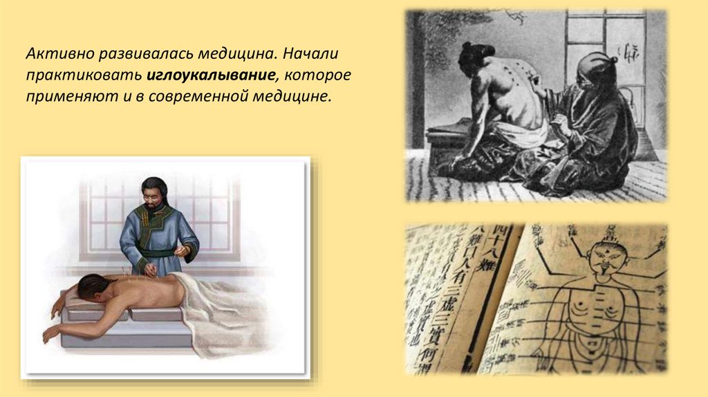 Активно развивалась медицина. Началипрактиковать иглоукалывание, которое
