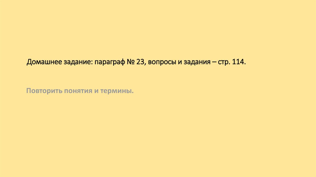 Домашнее задание: параграф № 23, вопросы и задания – стр. 114.Повторить понятия и термины.