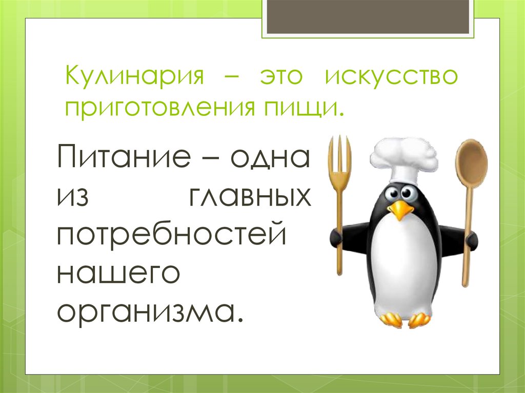 Кулинария – это искусствоприготовления пищи.
