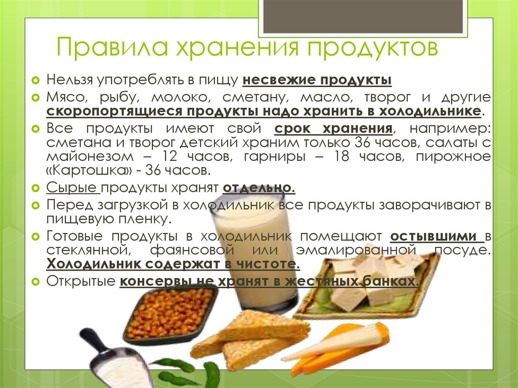 Правила хранения продуктовНельзя употреблять в пищу несвежие продукты