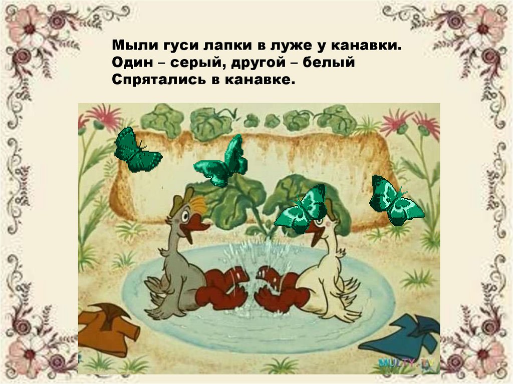Мыли гуси лапки в луже у канавки.Один – серый, другой – белый