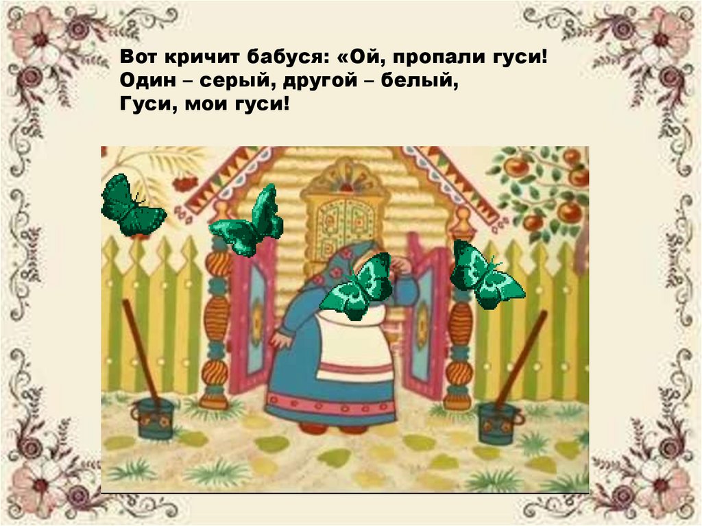 Вот кричит бабуся: «Ой, пропали гуси!Один – серый, другой – белый,