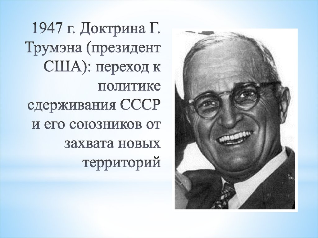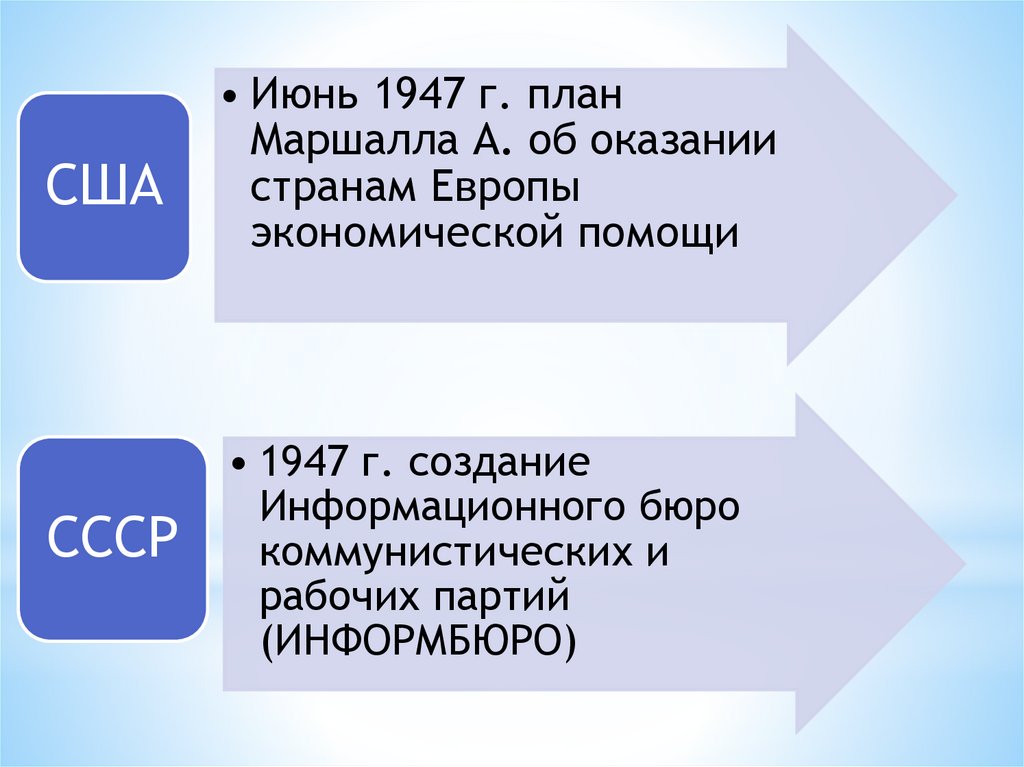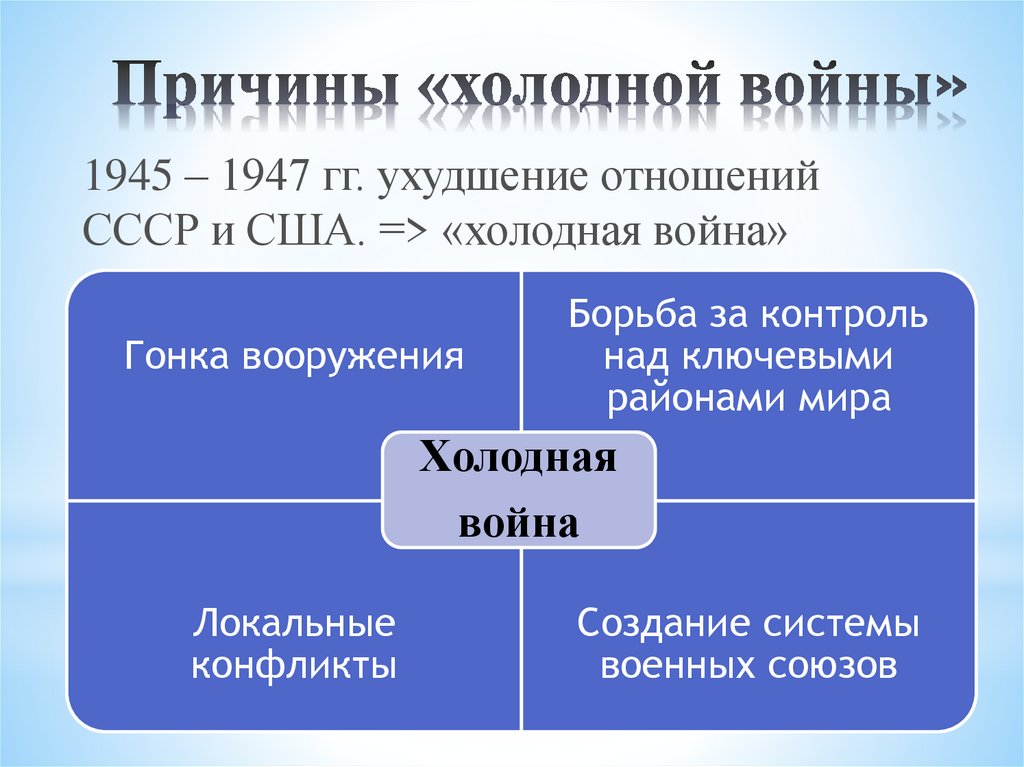 1945 – 1947 гг. ухудшение отношенийСССР и США. => «холодная война»