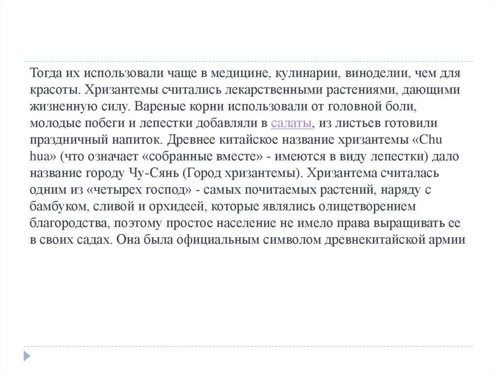 Тогда их использовали чаще в медицине, кулинарии, виноделии, чем длякрасоты. Хризантемы считались лекарственными растениями, дающими