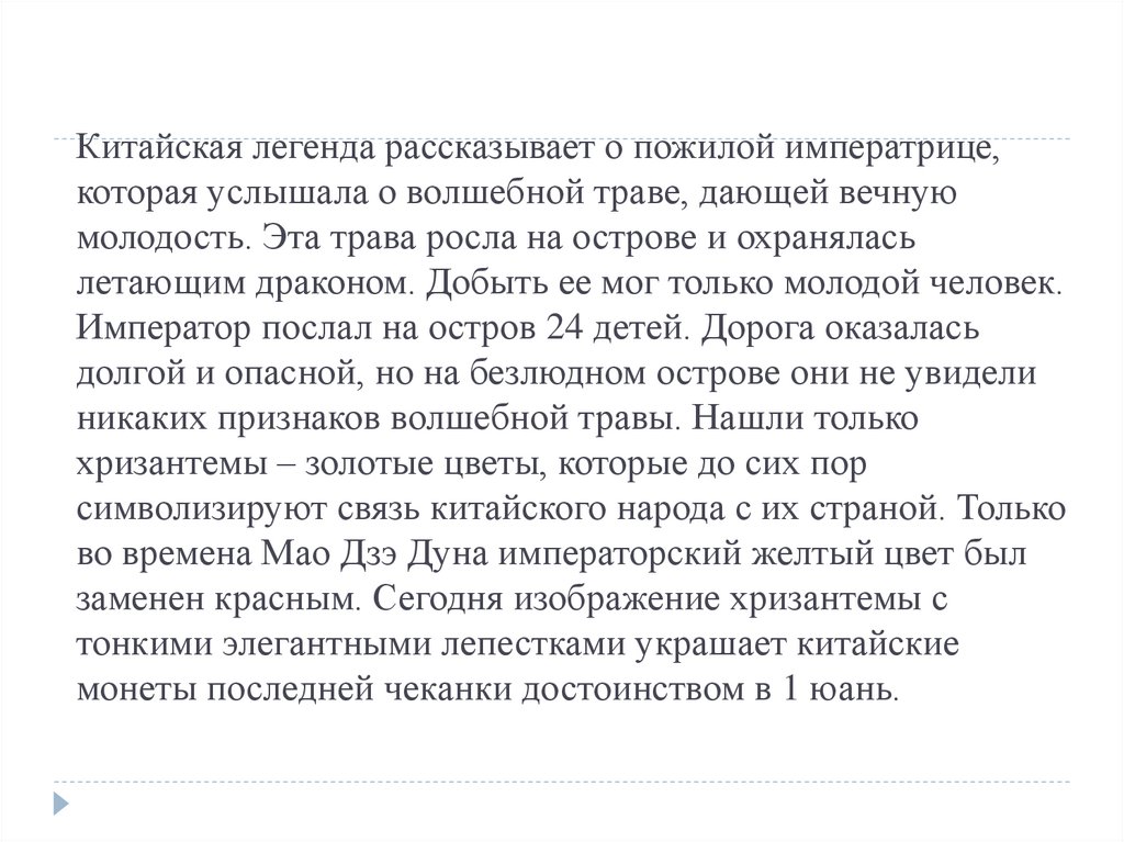 Китайская легенда рассказывает о пожилой императрице,которая услышала о волшебной траве, дающей вечную