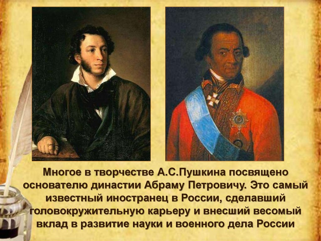 Многое в творчестве А.С.Пушкина посвященооснователю династии Абраму Петровичу. Это самый