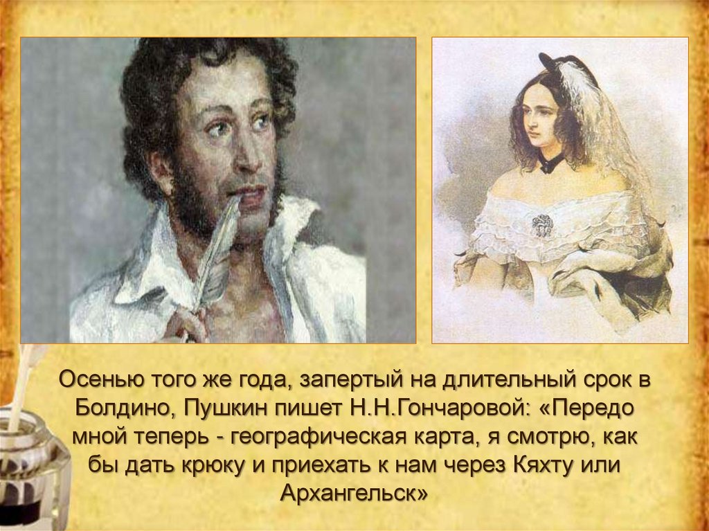 Осенью того же года, запертый на длительный срок вБолдино, Пушкин пишет Н.Н.Гончаровой: «Передо