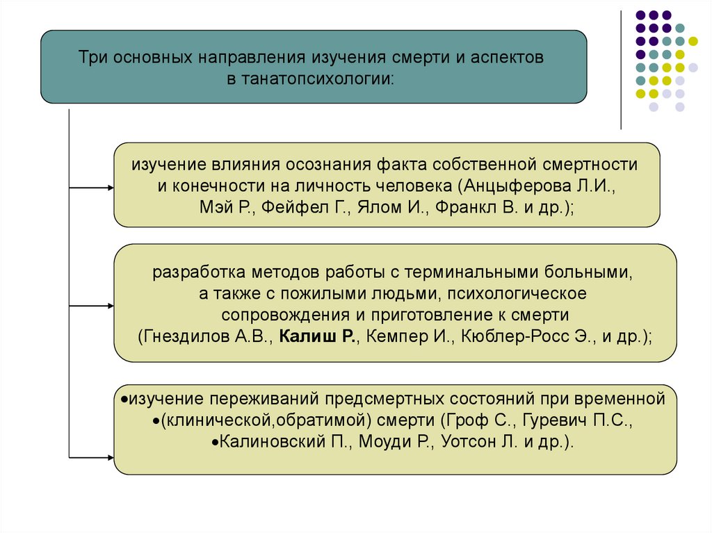 Три основных направления изучения смерти и аспектовв танатопсихологии:
