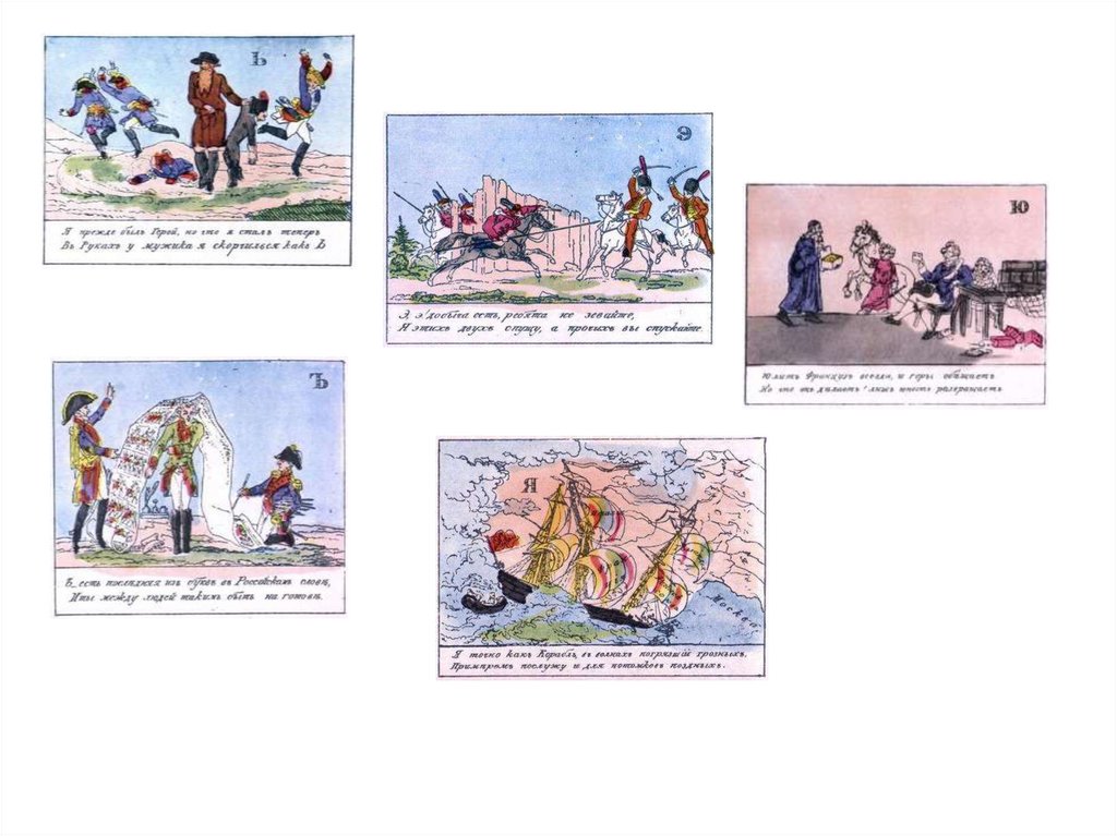 сорока злободневных, действенных, интересных в художественном отношении картиноккарикатур на тему Отечественной войны 1812 года, которые легли в основу детской азбуки. В