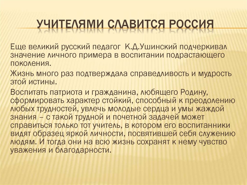 УЧИТЕЛЯМИ СЛАВИТСЯ РОССИЯЕще великий русский педагог К.Д.Ушинский подчеркивал