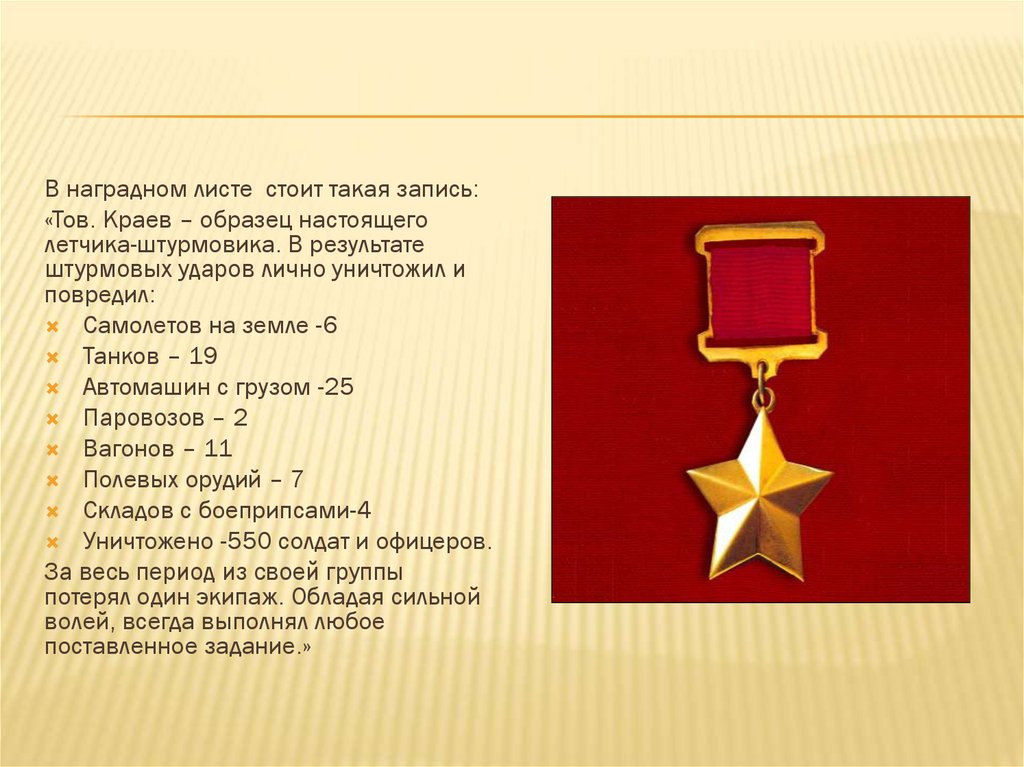 В наградном листе стоит такая запись:«Тов. Краев – образец настоящего