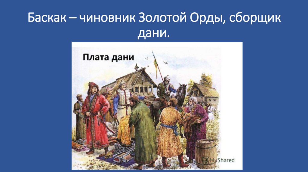 Баскак – чиновник Золотой Орды, сборщикдани.