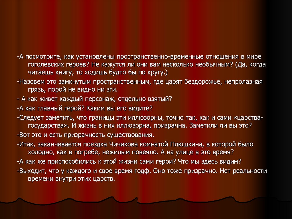 -А посмотрите, как установлены пространственно-временные отношения в мирегоголевских героев? Не кажутся ли они вам несколько необычным? (Да, когда