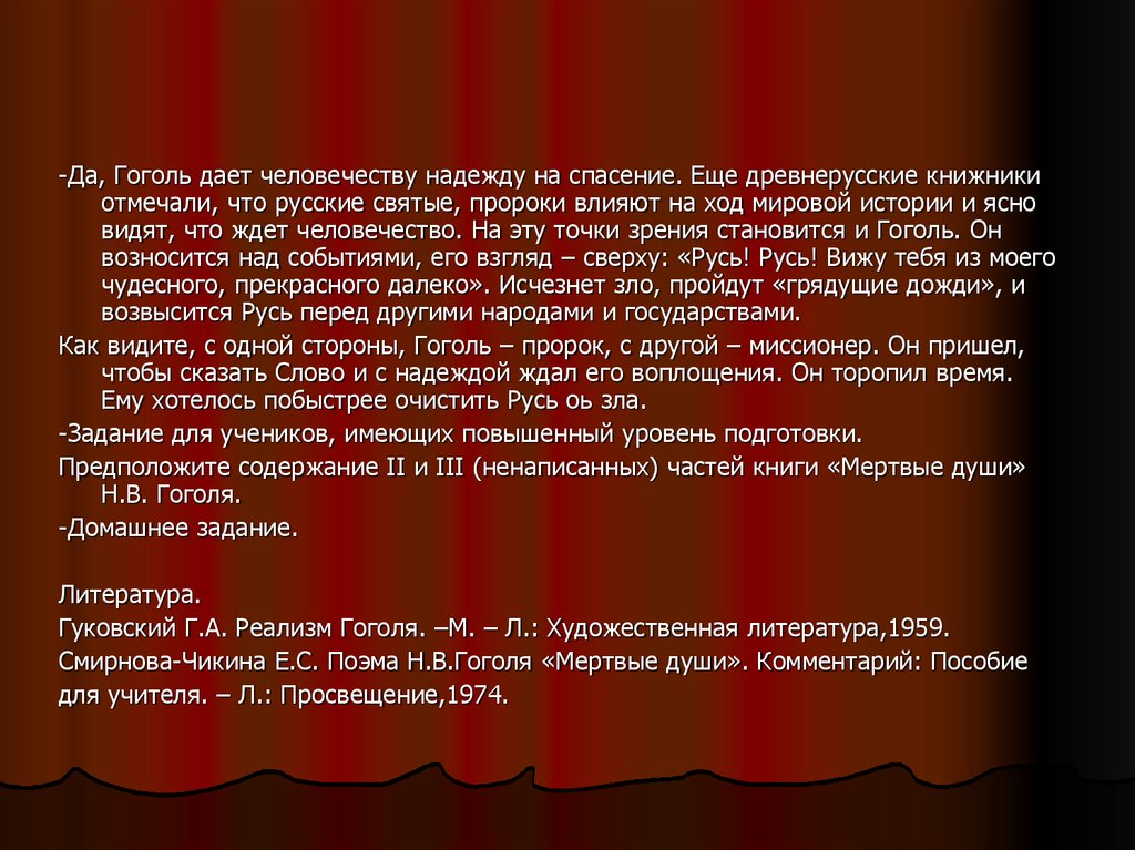 -Да, Гоголь дает человечеству надежду на спасение. Еще древнерусские книжникиотмечали, что русские святые, пророки влияют на ход мировой истории и ясно