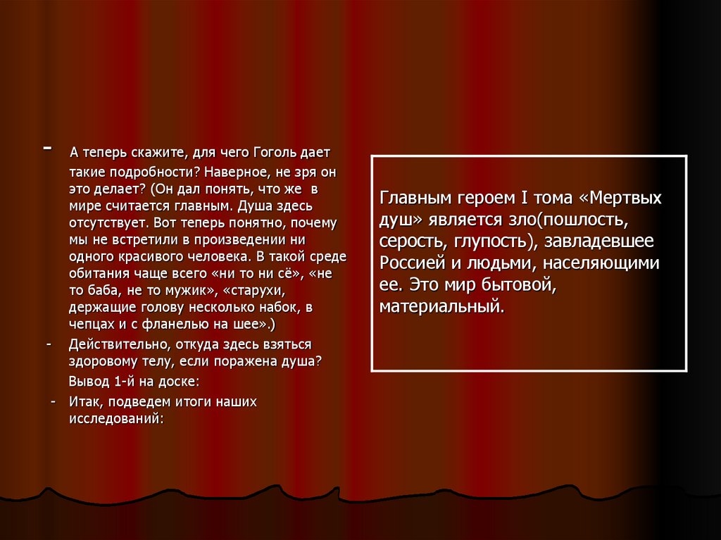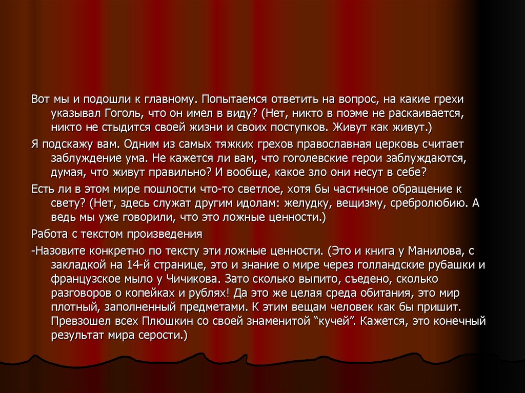 Вот мы и подошли к главному. Попытаемся ответить на вопрос, на какие грехиуказывал Гоголь, что он имел в виду? (Нет, никто в поэме не раскаивается,