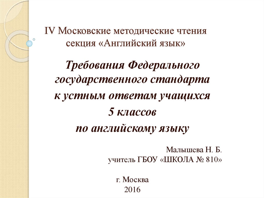 Требования Федерального государственного стандарта к устным ответам учащихся 5 классов по английскому языку