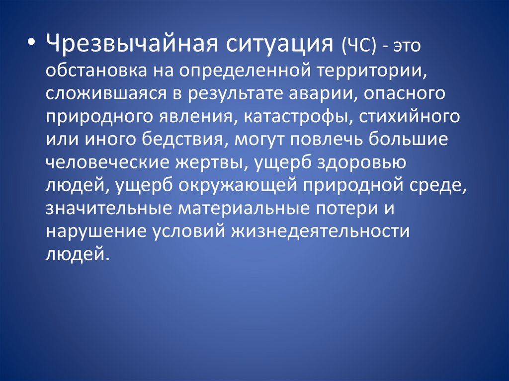 • Чрезвычайная ситуация (ЧС) - этообстановка на определенной территории,
