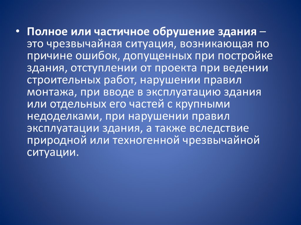 • Полное или частичное обрушение здания –это чрезвычайная ситуация, возникающая по