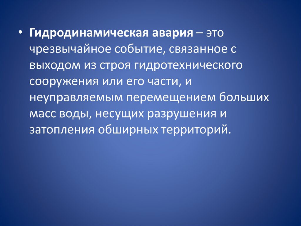 • Гидродинамическая авария – эточрезвычайное событие, связанное с
